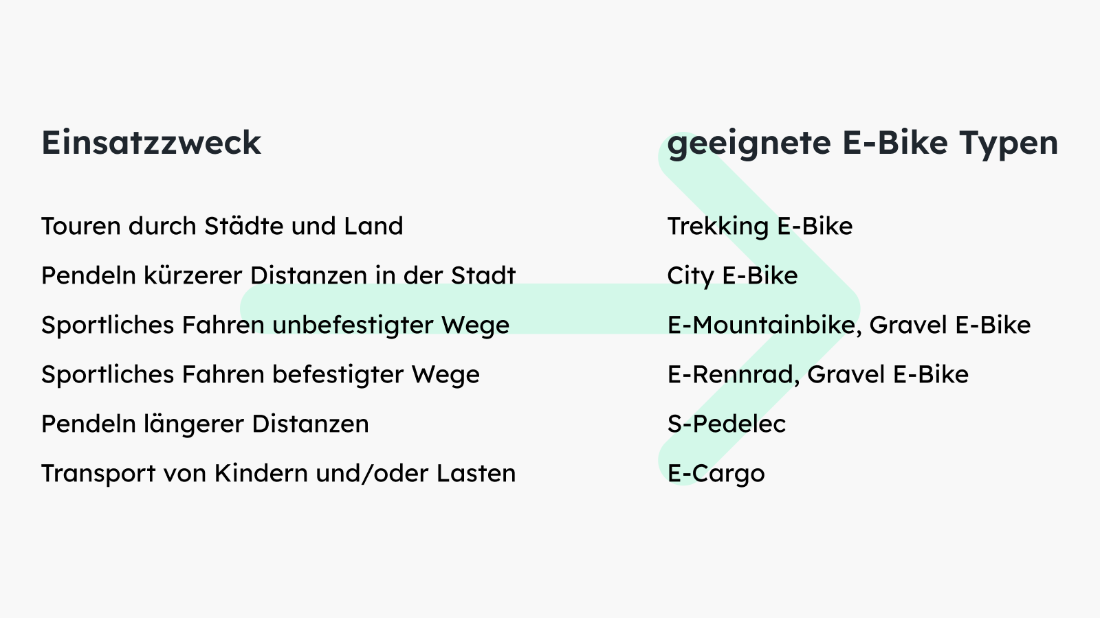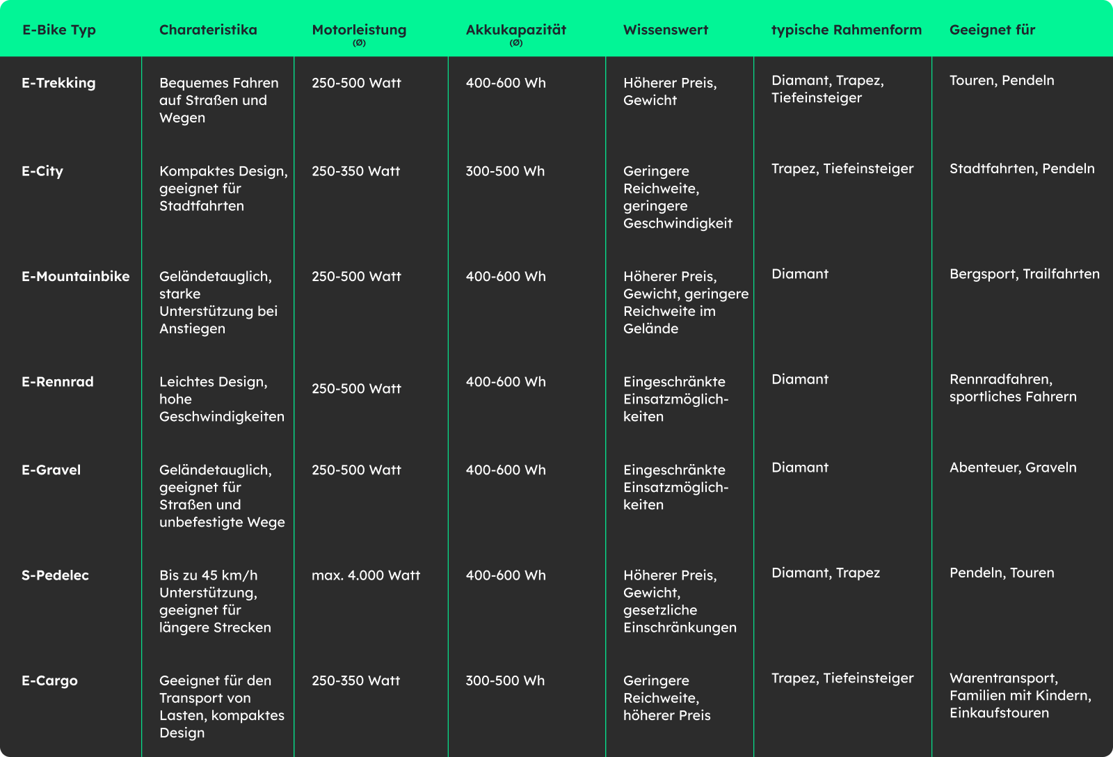 Hinweis: Diese Tabelle bezieht sich auf die gängigsten Ausführungen der jeweiligen E-Bike Typen. Darüber hinaus besteht eine Vielzahl an Varianten und Ausführungen, die für spezielle Bedürfnisse entwickelt wurden.